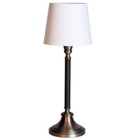 Dinant pöytävalaisin huokuu hienostunutta eleganssia, yhdistäen modernin muotoilun ja ajattoman käsityötaidon. Tumma metallijalka keinonahkasomisteella ja valkoisella koristesaumalla, tuo huoneeseen ripauksen luksusta. Hillitty muotoilu sopii saumattomasti monenlaisiin sisustustyyleihin, modernista klassiseen. Puuvillavarjostin pehmentää valoa, luoden lämpimän ja kutsuvan tunnelman.