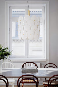 Mia Lagermanin muotoilema riippuvalaisin yhdistää ajattoman muotokielen ja harkitut yksityiskohdat. Kiiltävä valkoinen lasikupu ja messinkiset yksityiskohdat muodostavat näyttävän, mutta hillityn kokonaisuuden, joka kiinnittää huomion kuin veistoksellinen taide-esine.