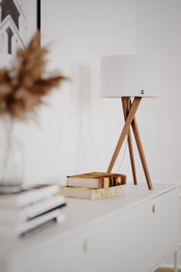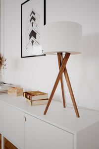 Skandinaavinen pöytävalaisin, jossa yhdistyvät selkeä muotoilu ja luonnonmateriaalit. Sen tukeva pähkinäpuinen jalka tuo sisustukseen syvyyttä ja hienostunutta lämpöä, kun taas valkoinen pellavavarjostin suodattaa valon pehmeästi, luoden miellyttävän tunnelman.