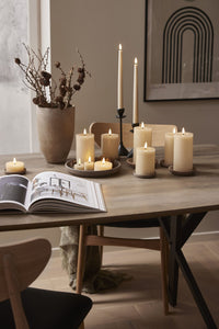 Vahasta valmistetun Flamme Flow tuikkukynttilän aitoa muistuttava LED-liekki ja kiiltävä, sulalta steariinilta näyttävä syvennys liekin alapuolella saavat sen näyttämään oikealta palavalta kynttilältä.