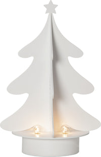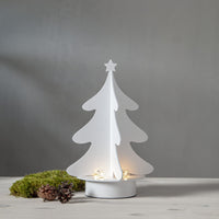 Moderni kynttelikkö, jossa on puinen kuusi pyöreällä alustalla. Lamput valaisevat kuusta alhaalta ylös ja luovat kauniin tunnelmavalaistuksen. Tämä kynttelikkö sopii käyttöön koko talveksi.