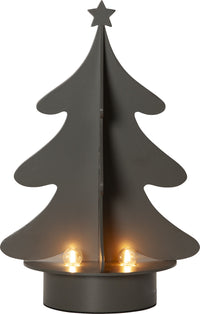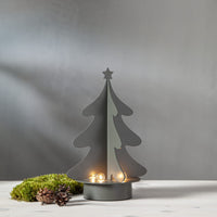 Moderni kynttelikkö, jossa on puinen kuusi pyöreällä alustalla. Lamput valaisevat kuusta alhaalta ylös ja luovat kauniin tunnelmavalaistuksen. Tämä kynttelikkö sopii käyttöön koko talveksi.
