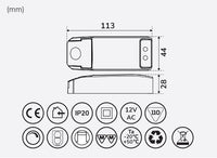 Muuntaja 12V AC. Sopii Llitt Alice -alasvaloihin sekä useimpiin vaihtovirralla toimiviin LED 12V AC -alasvaloihin. Sopii myös vanhempiin 12V halogeenialasvaloihin.