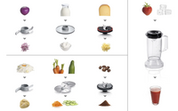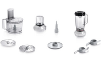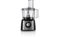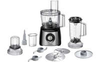 • Mukana tulevat varusteet: 2.3 l läpinäkyvä muovikulho (maks. 0.8 kg taikinalle), käännettävät raastin- ja viipalointiterät, vaahdotuslevy kerman ja valkuaisten vaahdottamiseen ja muovinen tehosekoitin (1 l)