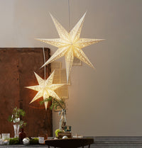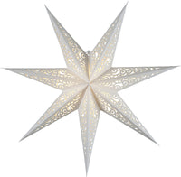 Vit pappstjärna med dekorativa mönster. Häng den i ett fönster för att skapa julstämning hemma.