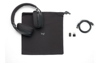 - I lådan: Logitech Zone Vibe trådlösa hörlurar, USB-C-mottagare, USB-C till USB-A-adapter, USB-C-laddningskabel (1,5 m), bärfodral, användardokumentation