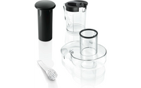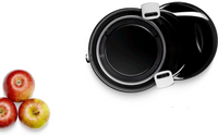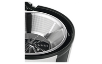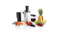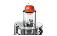 Det stora matningsröret (73 mm) gör det enkelt att bearbeta hela frukter och grönsaker. Säkerhetslås i aluminium på sidorna. Dropplåset på juicebehållaren förhindrar att vätska spills och håller arbetsytan ren. Juicebehållaren (1,25 l) har ett skumfilter. Automatisk borttagning av pressavfall. Stor, avtagbar behållare (2 l) för fruktkött. Kabelbox.